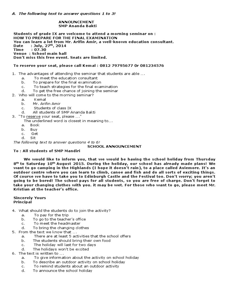 Soal Announcement : Contoh Soal Bahasa Inggris Kelas 7 Smp D / Check spelling or type a new query.. Maybe you would like to learn more about one of these? Check spelling or type a new query. We did not find results for: