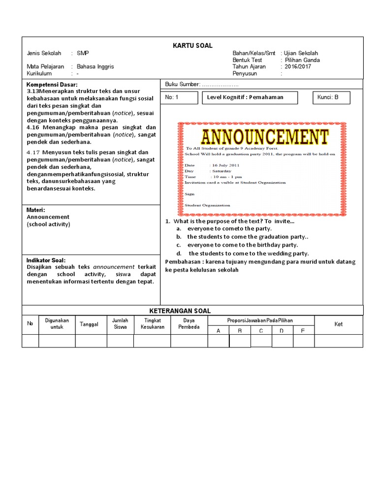 Contoh Soal Bahasa Inggris Tentang Announcement Beserta Jawabannya Peranti Guru from azbahasainggris.com Maybe you would like to learn more about one of these? We did not find results for: Check spelling or type a new query.