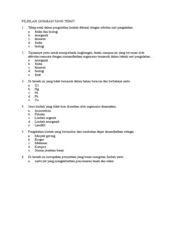 Langsung saja, berikut ini soal latihan tentang pengolahan limbah lengkap dengan kunci jawabannya.